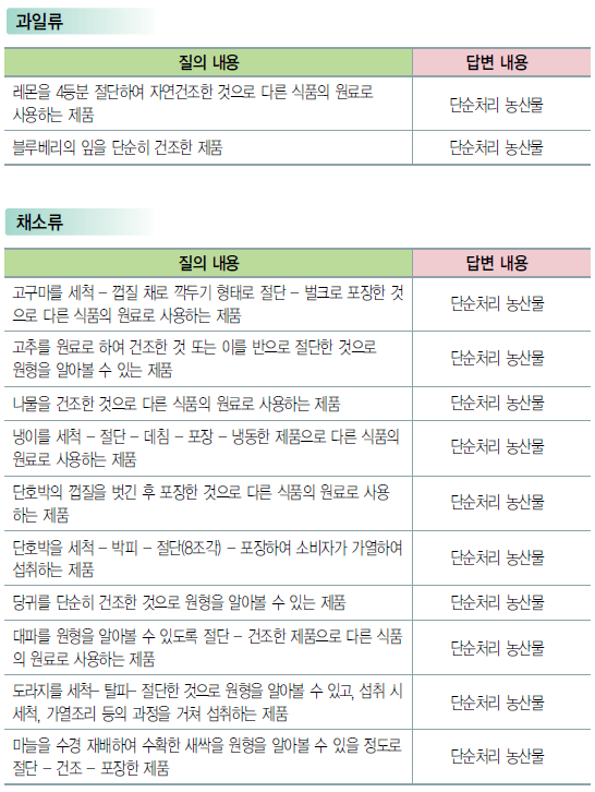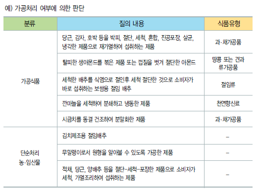 예시1) 데치거나 세척 후에 섭취하도록 한 나물은 단순처리 농산물.