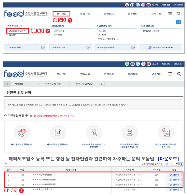 ①전자민원 > 민원신청하기 > 해외제조업소 등록신청 클릭