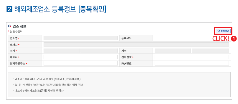 ① 해외제조업소명, 소재지, 국가 입력 후 검색