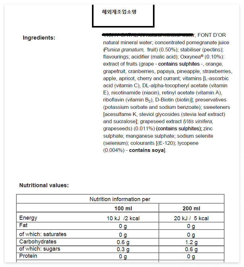 원재료 내역들이 100% 배합비율로 기재되어 있어야 합니다.