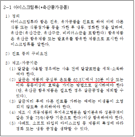 예를 들어, 아래 발췌된 내용은 아이스크림류 기준 및 규격 인데요.