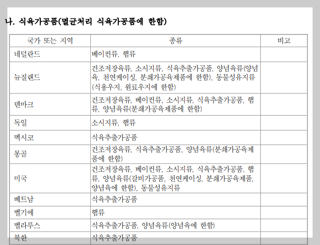 아래의 표는 축산물가공품의 수입가능 지역을 리스트해 놓은 것입니다.