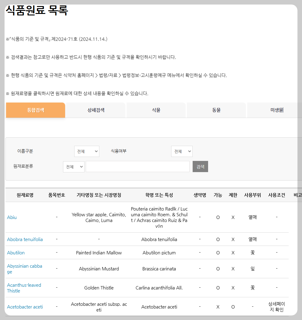 사용가능한 원료목록은 식품안전나라 사이트에서도 확인할 수 있습니다.